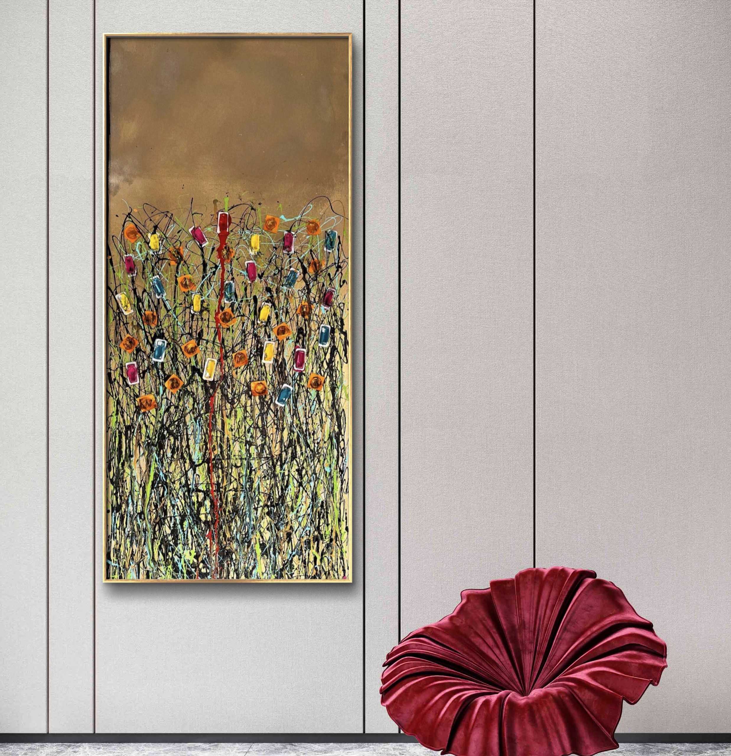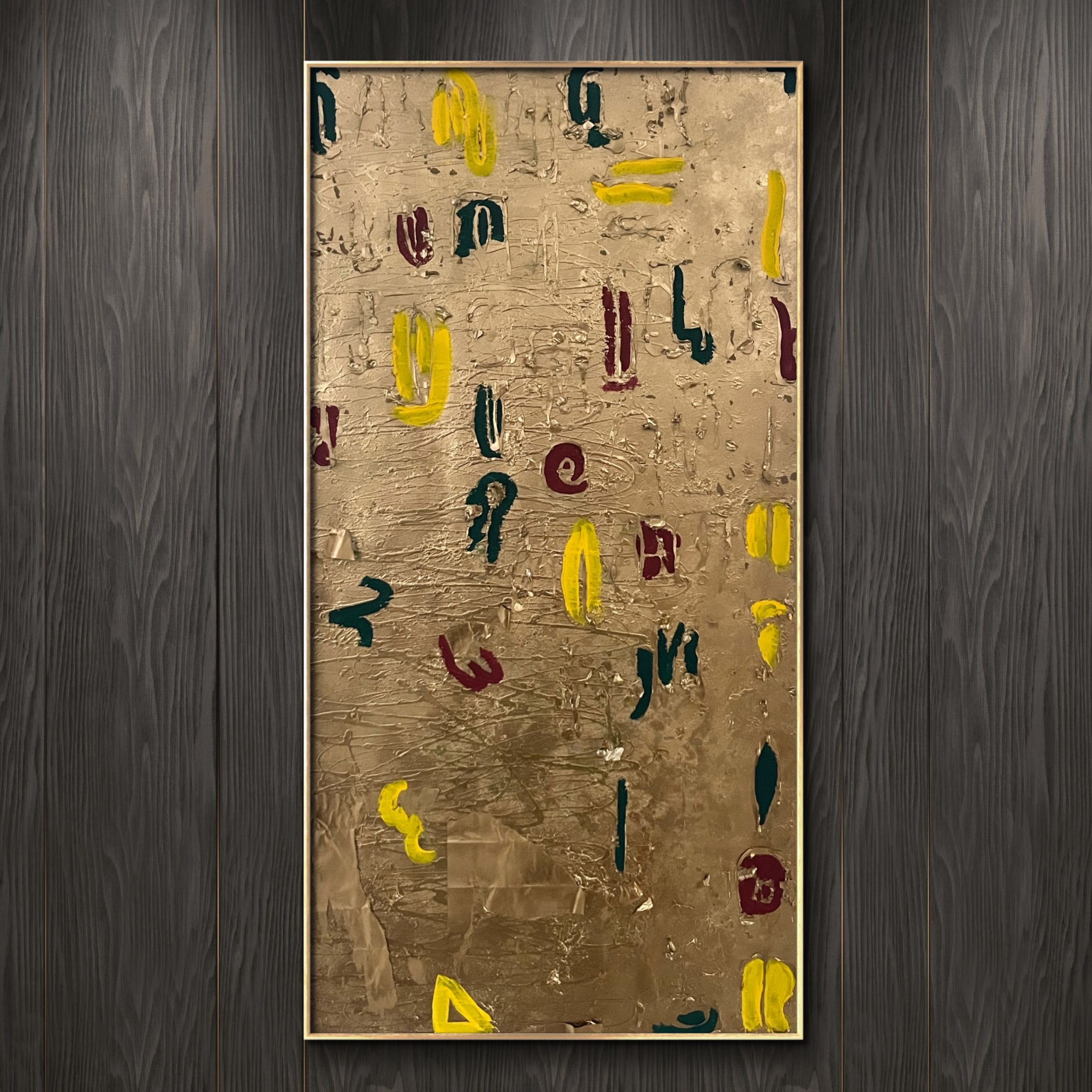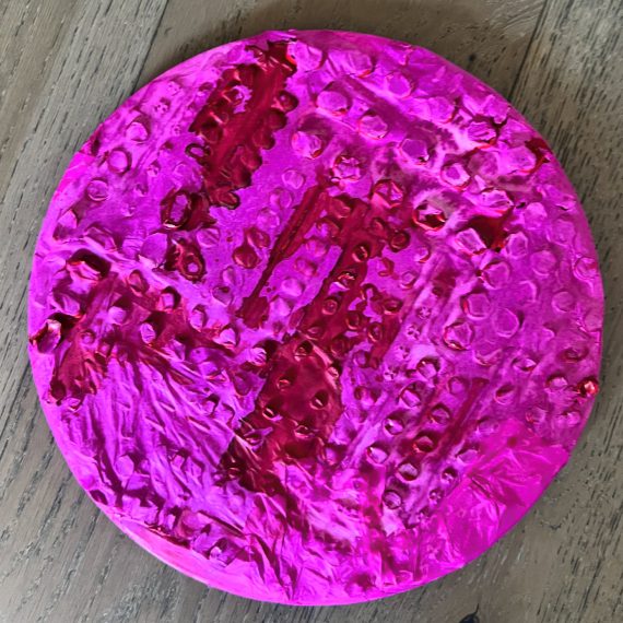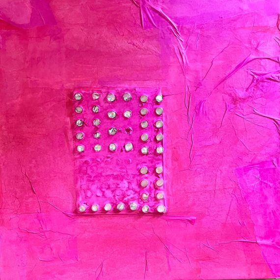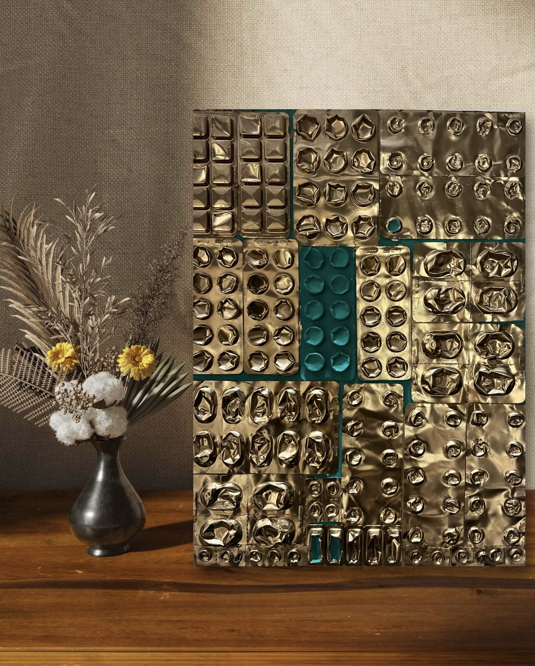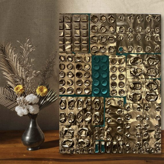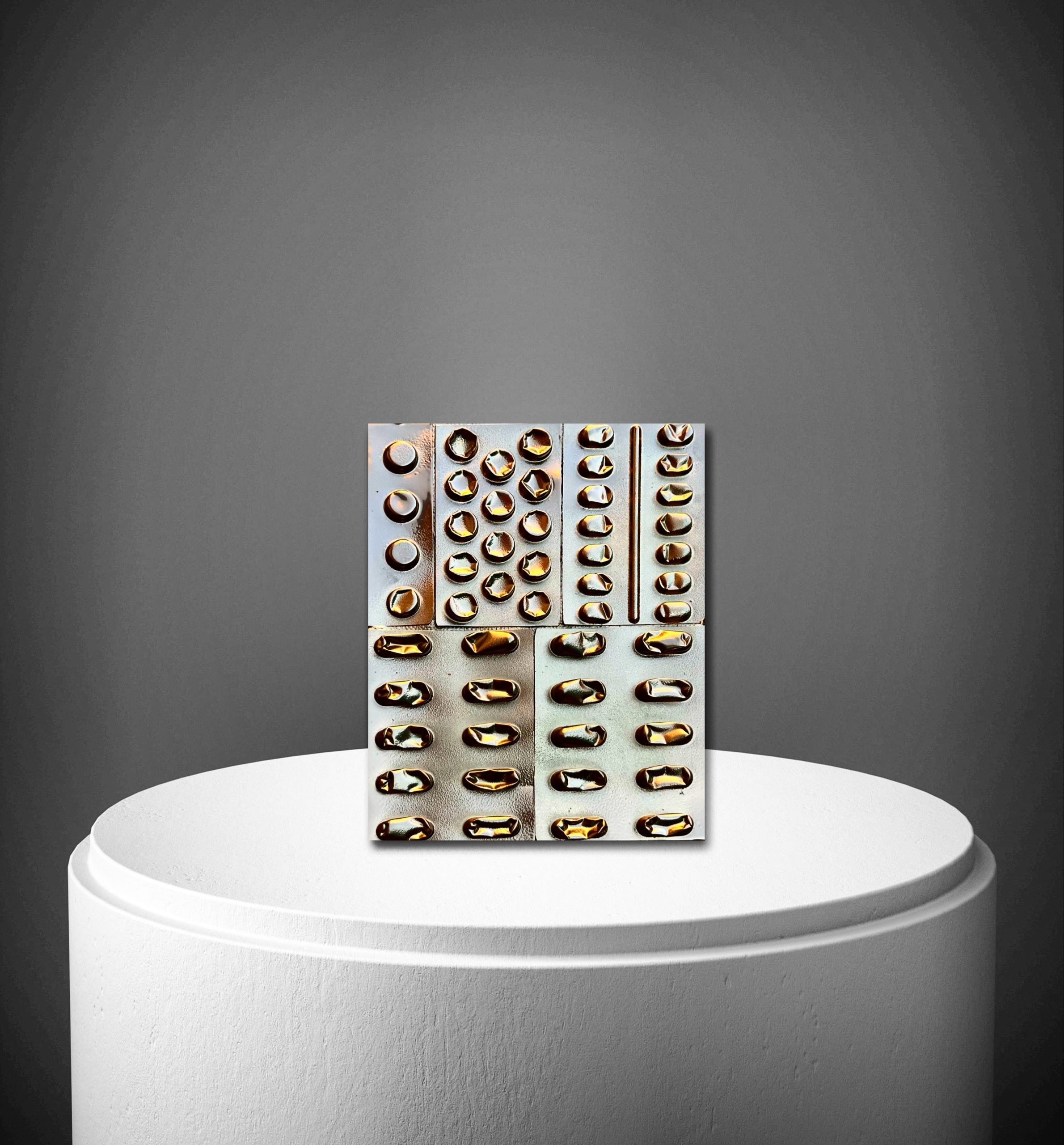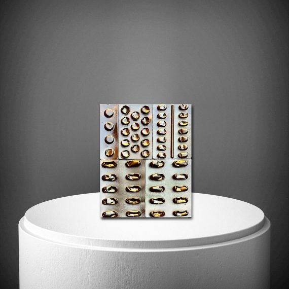 DISCREPANZE: A partire dai lavori in cui il blister era protagonista (come nei lingotti) e ricopriva l’intera superfice, qui il blister viene strappato. Dalle insenature che si creano attraverso l’utilizzo della colla a caldo e quello che rimane dal suo strappo nascono simboli e lettere. Un nuovo linguaggio, che antepone la parola, con il suo potere di scavare nel profondo di noi stessi per capire l’origine del nostro malessere. Anteporre la parola, il dialogo, all’utilizzo del farmaco. Mai il contrario.
